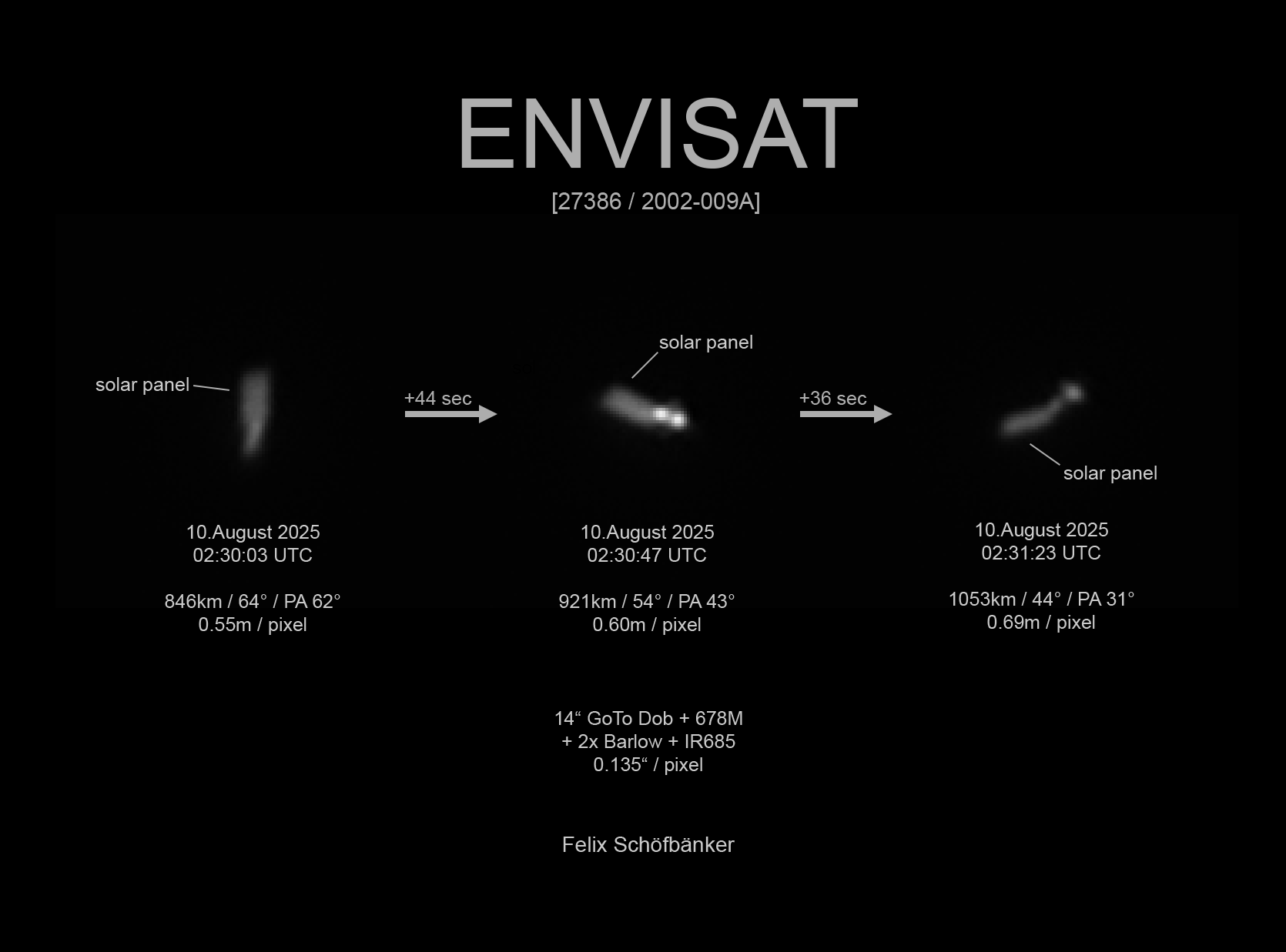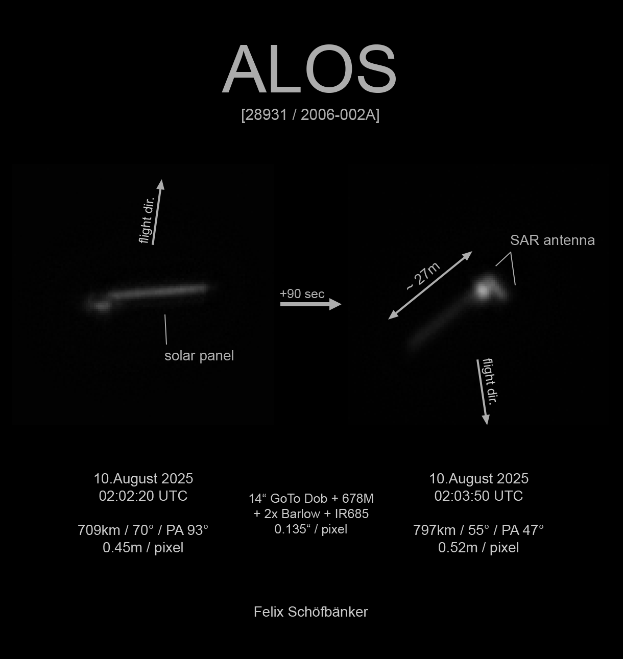 As a short introduction to myself, my equipment, and my hobby, my name is Felix Schöfbänker, and I am an amateur satellite photographer from Austria. Currently, I use a 14” GoTo Dobsonian from Skywatcher as my main telescope. My interest in astrophotography started at the beginning of 2022, when I got an 8” Newtonian on an equatorial mount for deep-sky astrophotography. Then, around late 2023, my interest switched over to satellite imaging and tracking, which are the main kinds of activities I perform now.