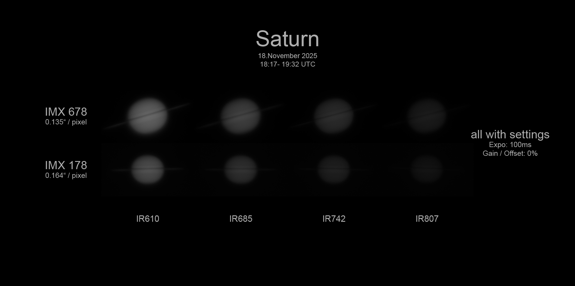To get an idea of the IR sensitivity relative to the IMX178 sensor, I took images of Saturn with all four filters: